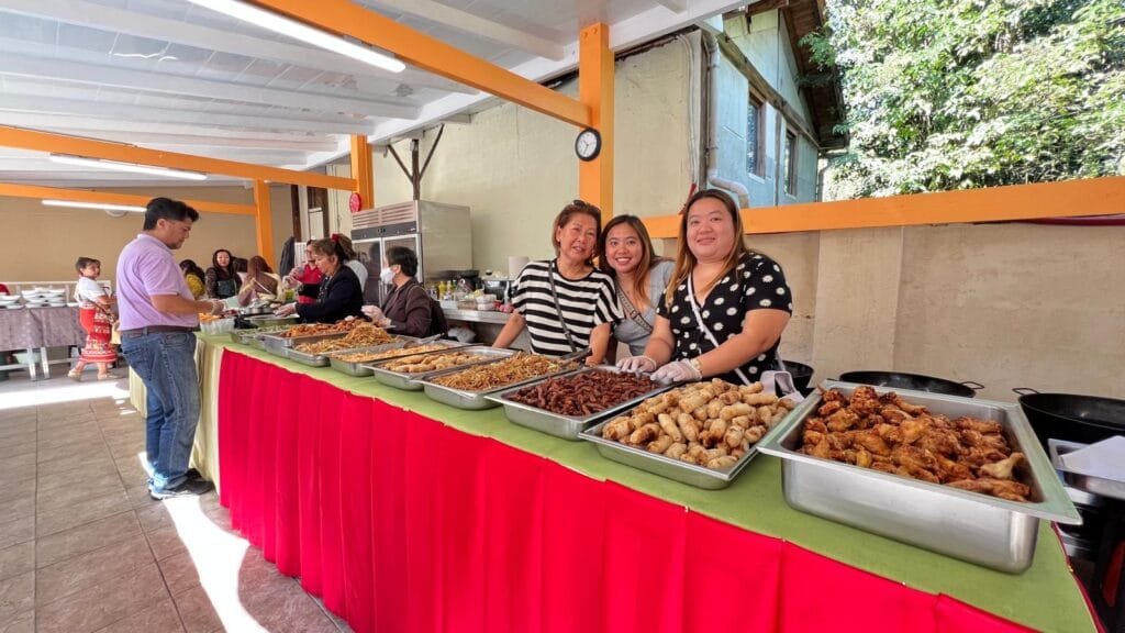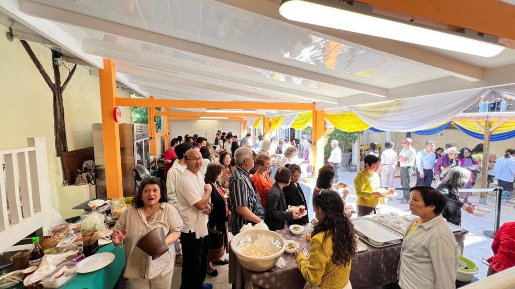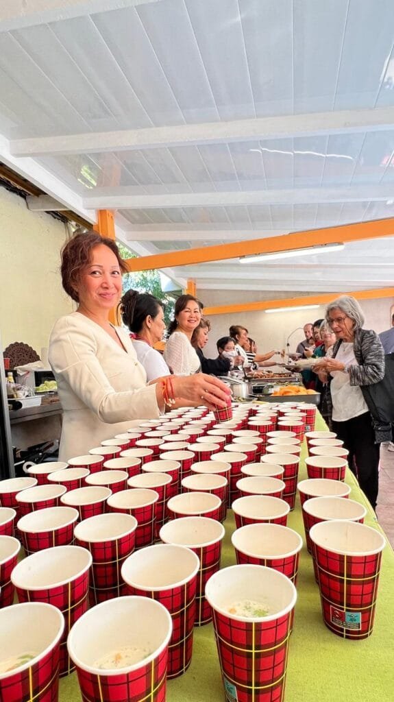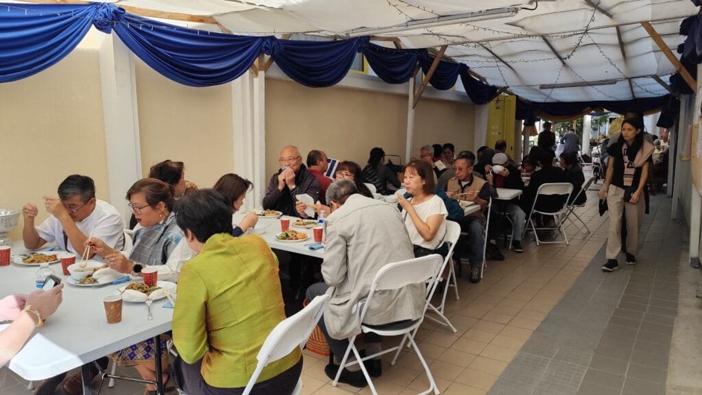 Comme le veut la coutume, l’événement a été un véritable festin de la générosité. Plusieurs stands extérieurs grouillaient de bénévoles affairés à servir une abondance de plats et de mets traditionnels. Les images témoignent d’une organisation impressionnante, avec de longues tables dressées débordant de nourriture et de boissons, comme ces rangées de gobelets rouges de dessert.