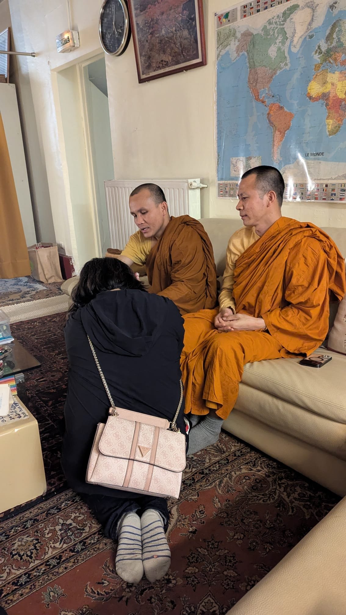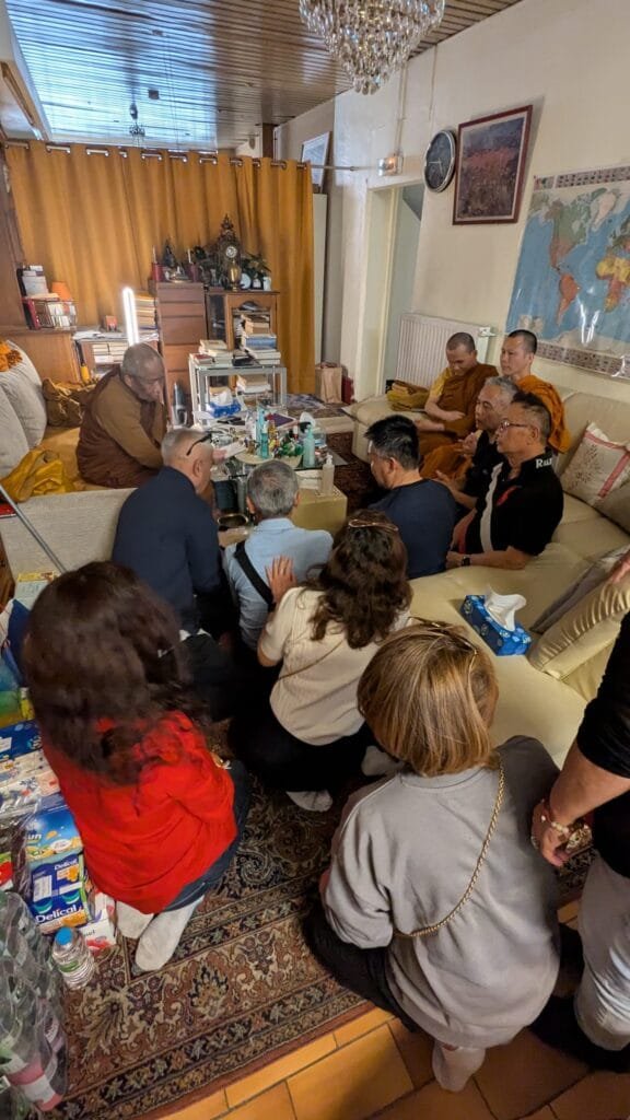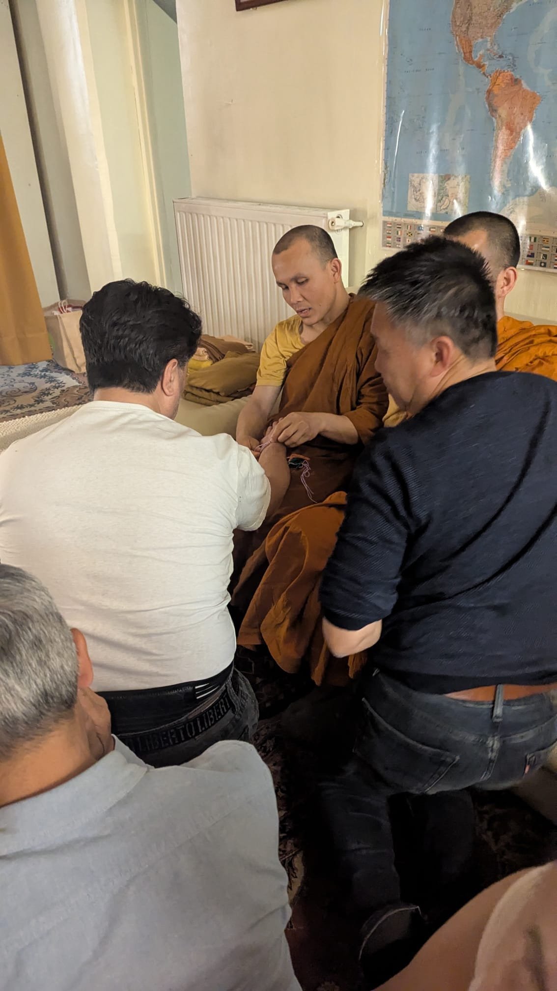 L’émotion est palpable lorsque nous remettons l’enveloppe au Grand Vénérable après une longue séance de comptage dans même lieu. Ses yeux s’illuminent en découvrant le fruit de nos efforts. Un sourire bienveillant éclaire son visage tandis qu’il exprime sa profonde gratitude pour notre dévouement, murmurant des paroles de sagesse et de prospérité pour nous tous. Puis, avec une douceur infinie, il entame la cérémonie des ficelés. Pour chacun d’entre nous, il prend un fin cordon de couleurs et le noue délicatement autour du poignet. Chaque nœud, symbole de protection, de santé et de bonheur, vient sceller ces précieuses bénédictions. Un sentiment de joie et de fierté nous envahit. Savoir que cette somme généreuse contribuera aux besoins de la pagode et de sa communauté, enrichi de cette marque spirituelle, est notre plus belle récompense. La fatigue s’estompe devant ce moment de partage et de communion, renforçant les liens qui nous unissent au sein de l’association.